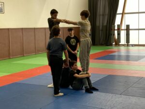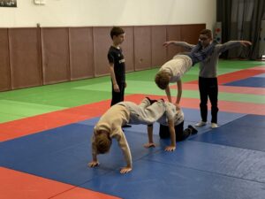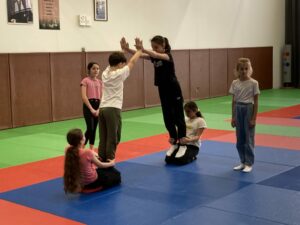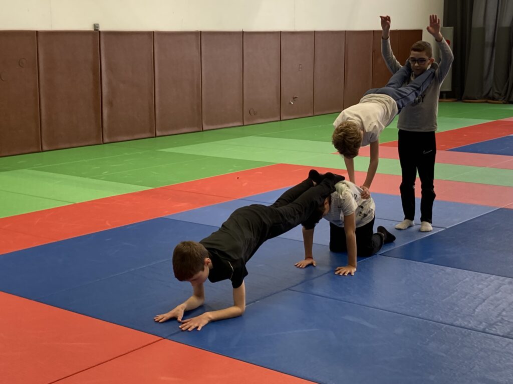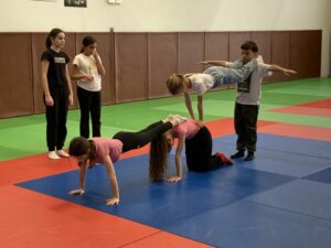 Tous les élèves ont joué les rôles de : voltigeur, pareur, porteur. Tous ont respecté les règles de sécurité : le voltigeur ne doit jamais descendre de son porteur en sautant; le voltigeur doit s’aider du pareur pour monter sur le porteur; le voltigeur lâche la main du pareur lorsqu’il a trouvé son point d’équilibre; le pareur reste proche du voltigeur prêt à intervenir.
