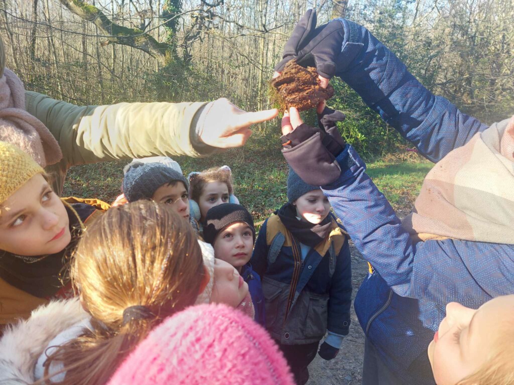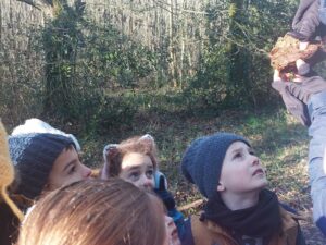 Lundi, malgré le froid et avec un beau soleil, nous avons passé l’après-midi en forêt à découvrir les petites bêtes ainsi que les champignons, les feuilles, les traces, le lichen, les bogues… Les élèves avaient beaucoup de questions pour Justine !