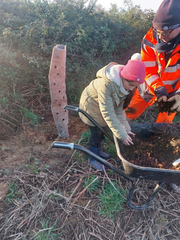 Chaque élève avait une pousse qu’ils ont pu mettre en terre dans l’allée 21. Ensuite, ils ont mis un tuteur et une chaussette en peau de mouton pour protéger leur futur arbre ainsi que du paillage.