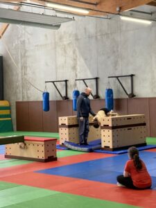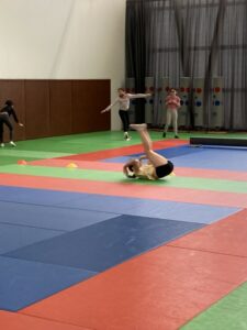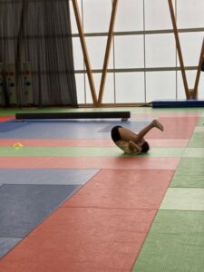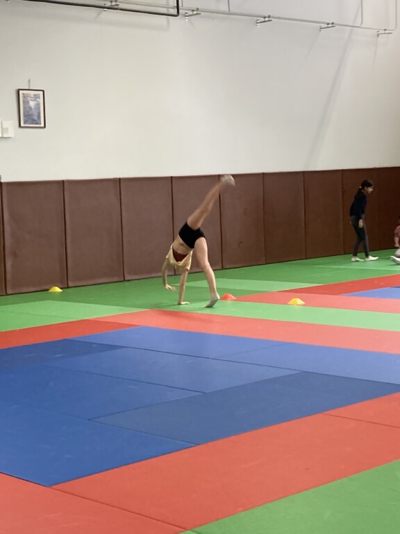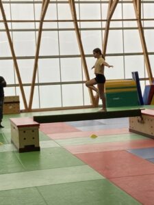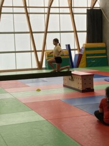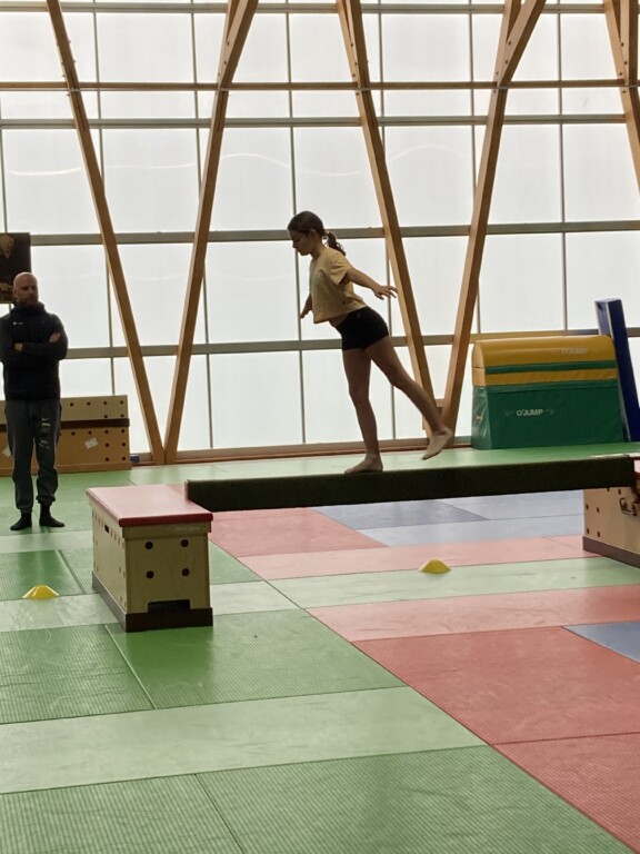 Au départ de notre enchaînement, nous devions nous présenter. Ensuite, nous avions à faire une bascule en avant sur une barre fixe puis deux équilibres sur une poutre. Nous faisions un saut pour descendre de la poutre et enchaînions sur une roulade avant , roulade arrière et une chandelle. Ceux et celles qui le souhaitaient pouvaient faire une roue. Pour terminer notre enchaînement nous devions saluer.