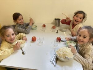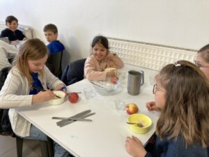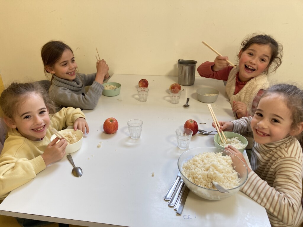 A midi, ils ont eu un déjeuner spécial avec un bol de riz et une pomme.